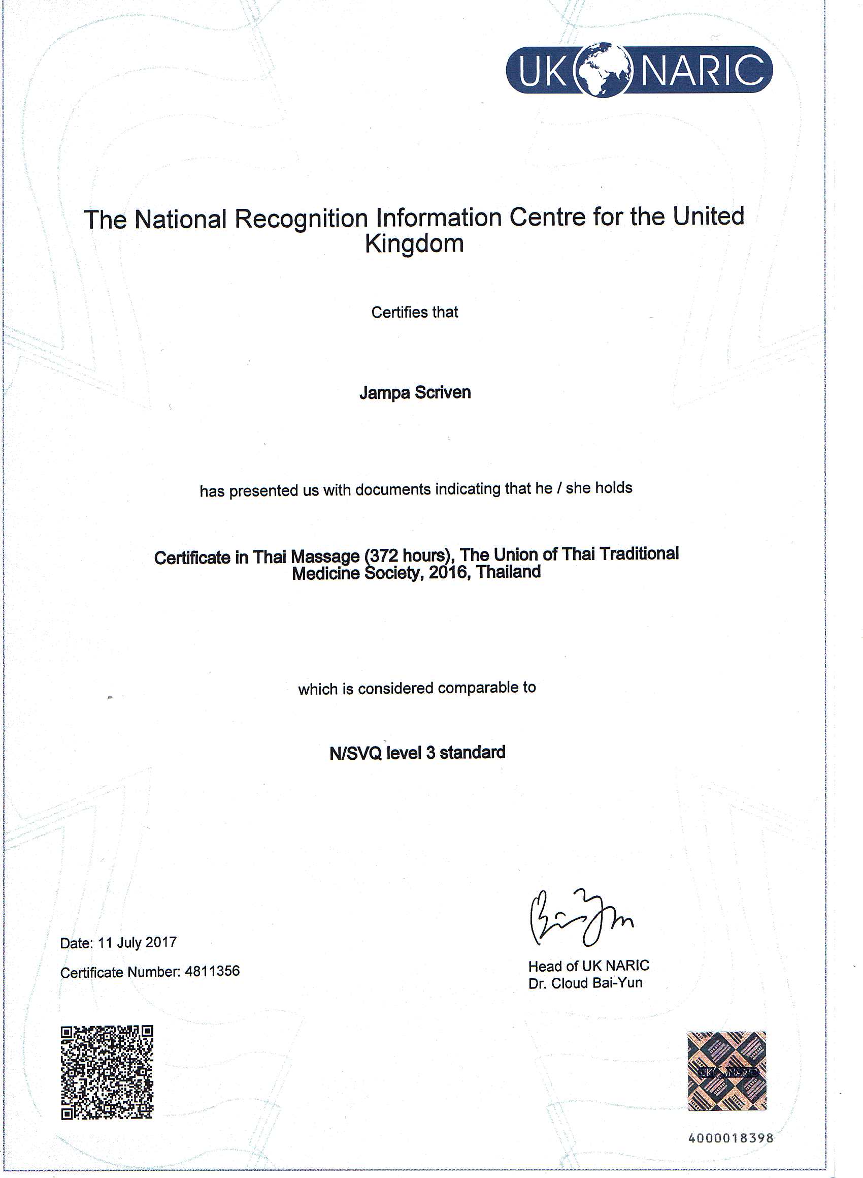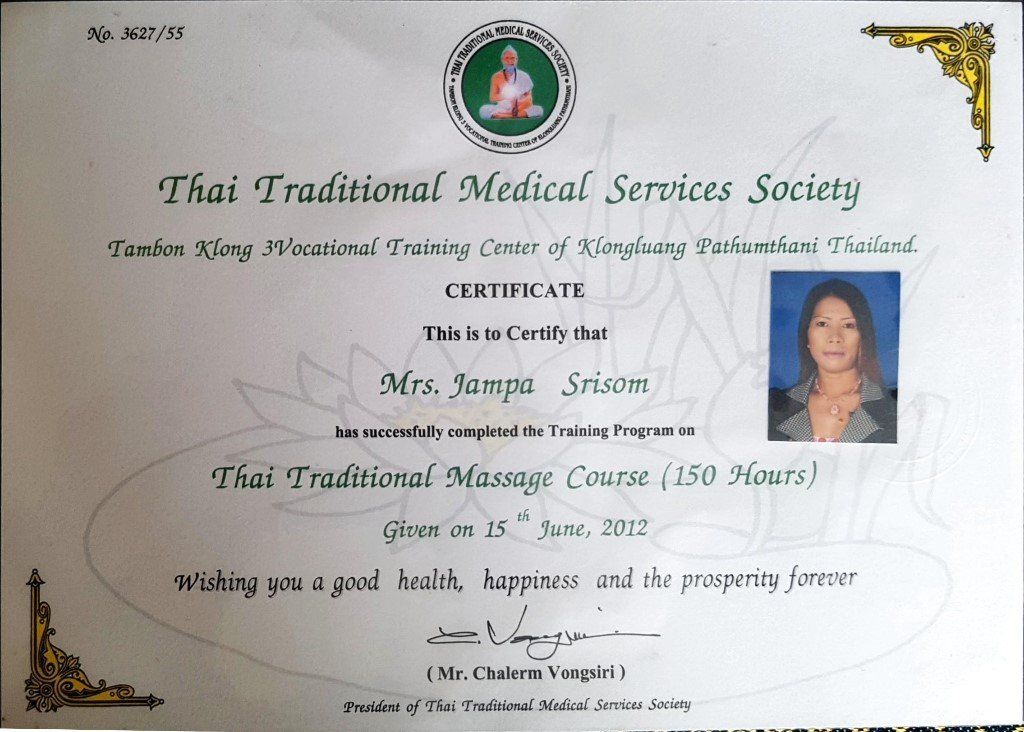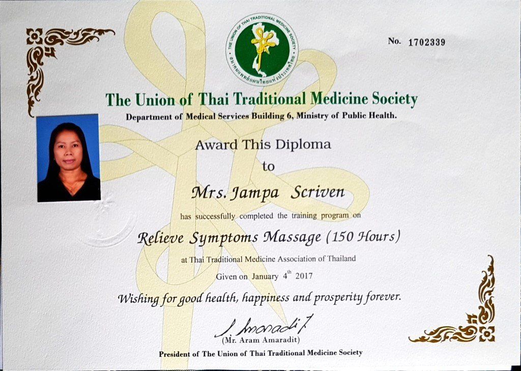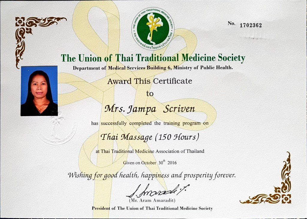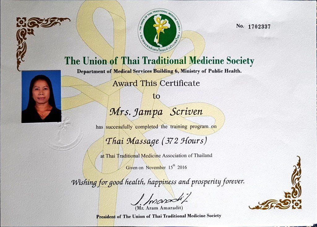 Jampa is traditionally trained in Thailand and her qualifications are recognised in the UK by the National Recognition Information Centre NA.R.I.C. for the United Kingdom,