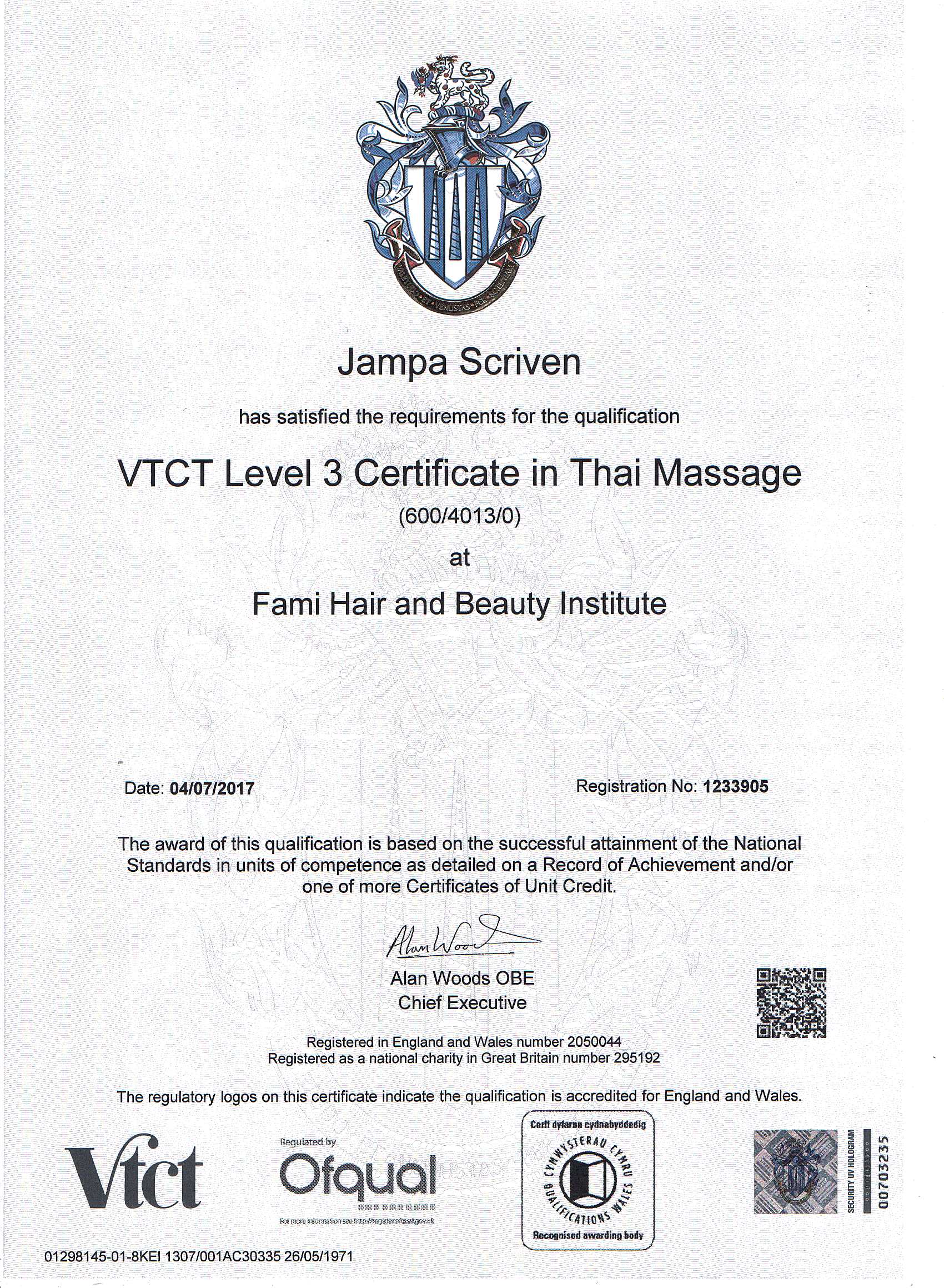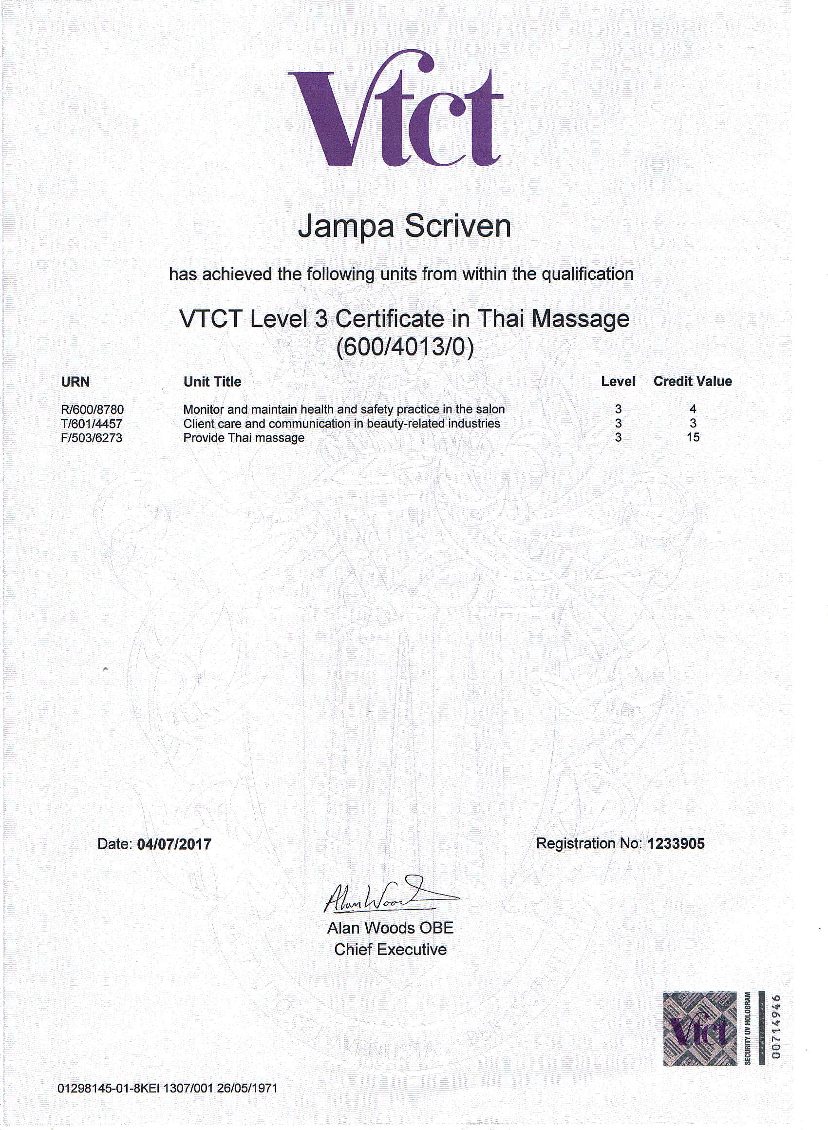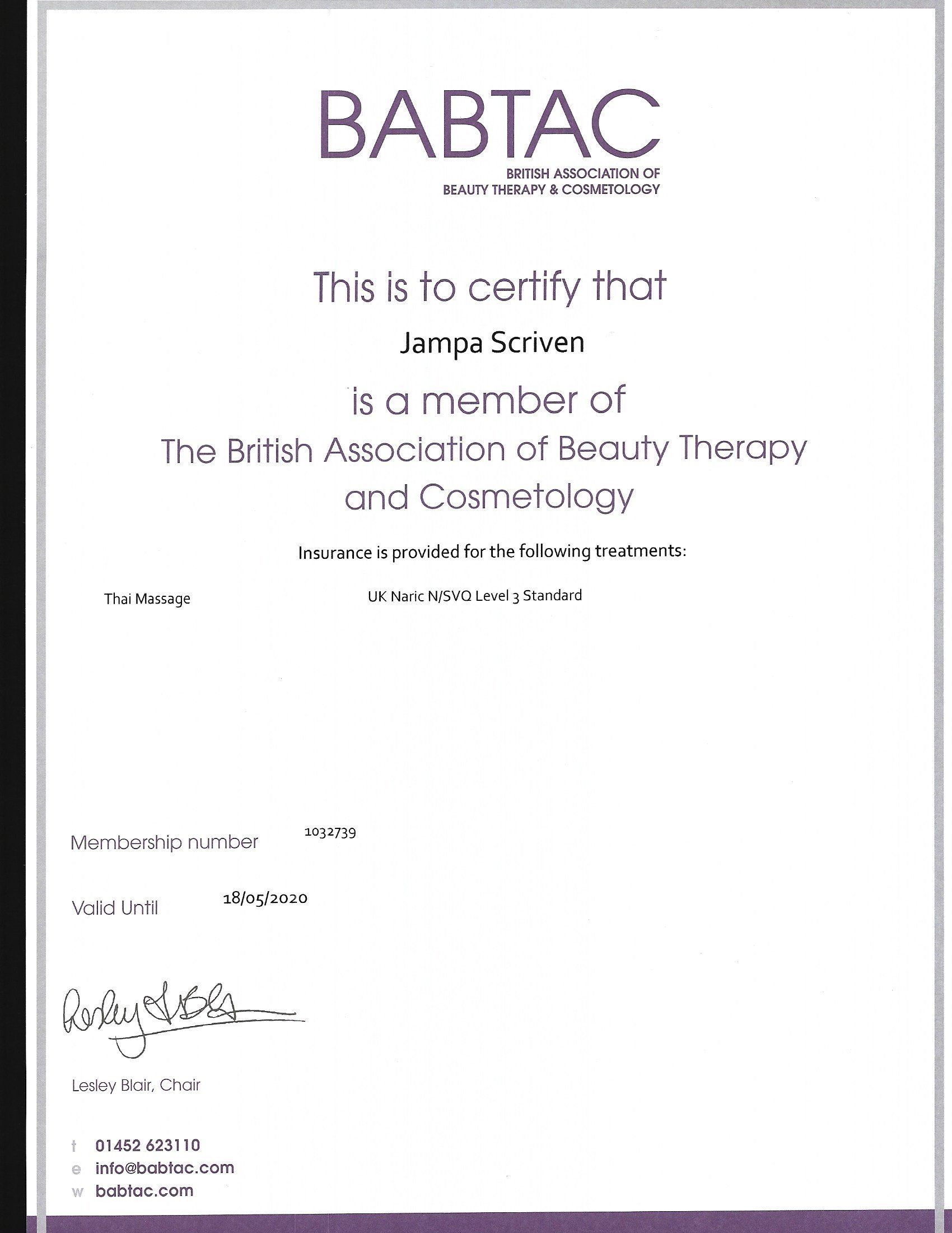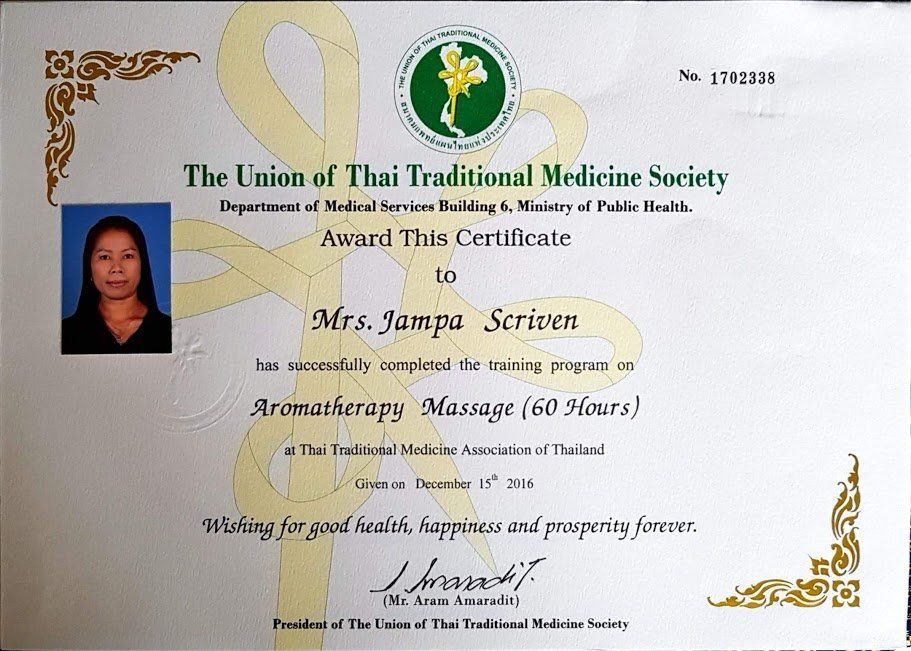 Jampa is traditionally trained in Thailand and her qualifications are recognised in the UK by the National Recognition Information Centre NA.R.I.C. for the United Kingdom,